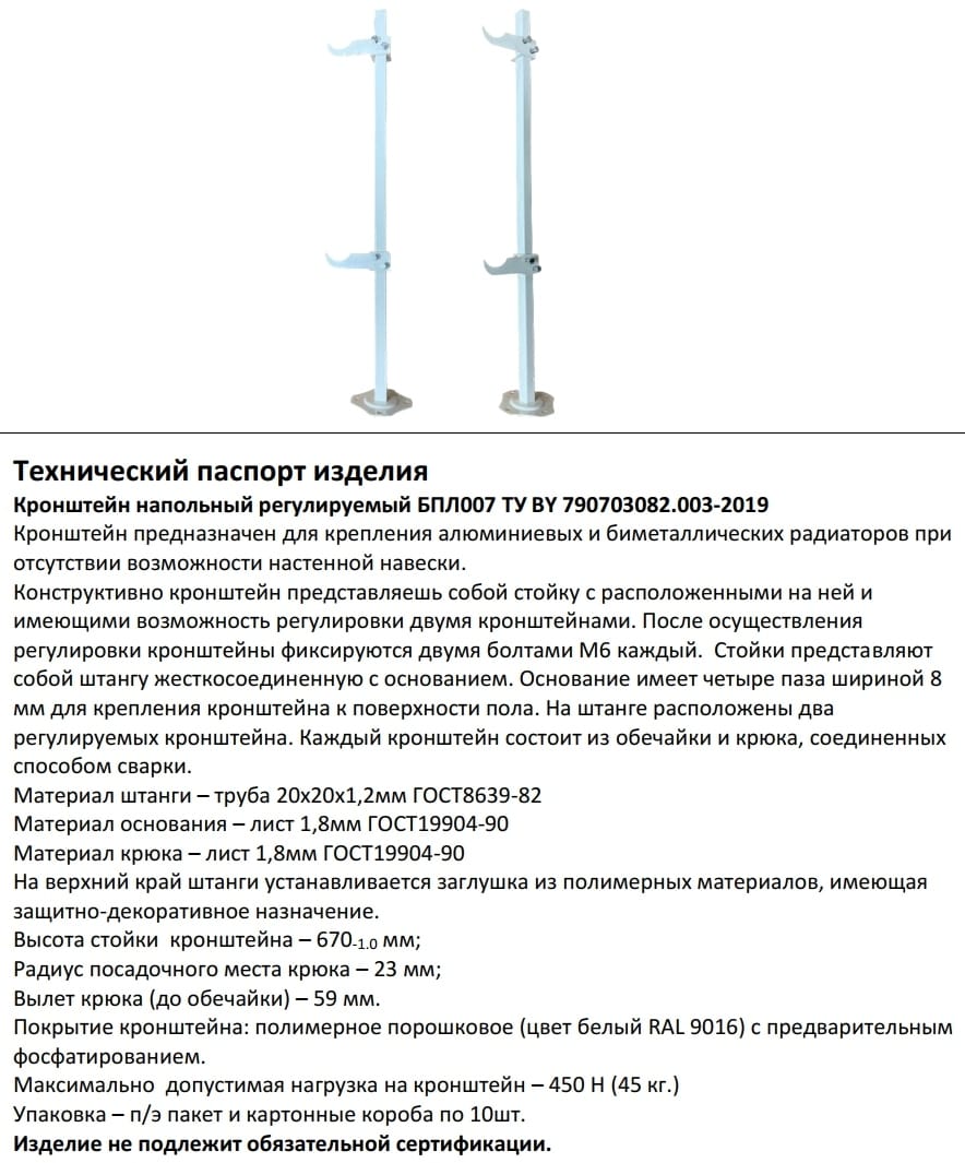 Конструктивно кронштейн представляет собой стойку с расположенными на ней и имеющими возможность регулирования двумя кронштейнами. После осуществления регулировки кронштейны фиксируются двумя болтами М6 каждый. Стойка представляет собой штангу жесткосоединенную с основанием. Основание имеет четыре паза шириной для крепления кронштейна к поверхности пола. На штанге расположены два регулируемых кронштейна. Каждый кронштейн состоит из обечайки и крюка, соединенных способом сварки.