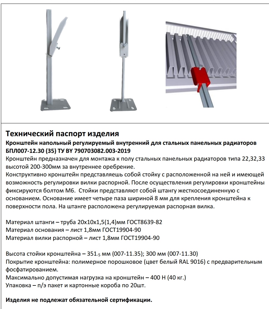 Кронштейн предназначен для монтажа к полу стальных панельных радиаторов высотой 200-300 мм за внутреннее оребрение.