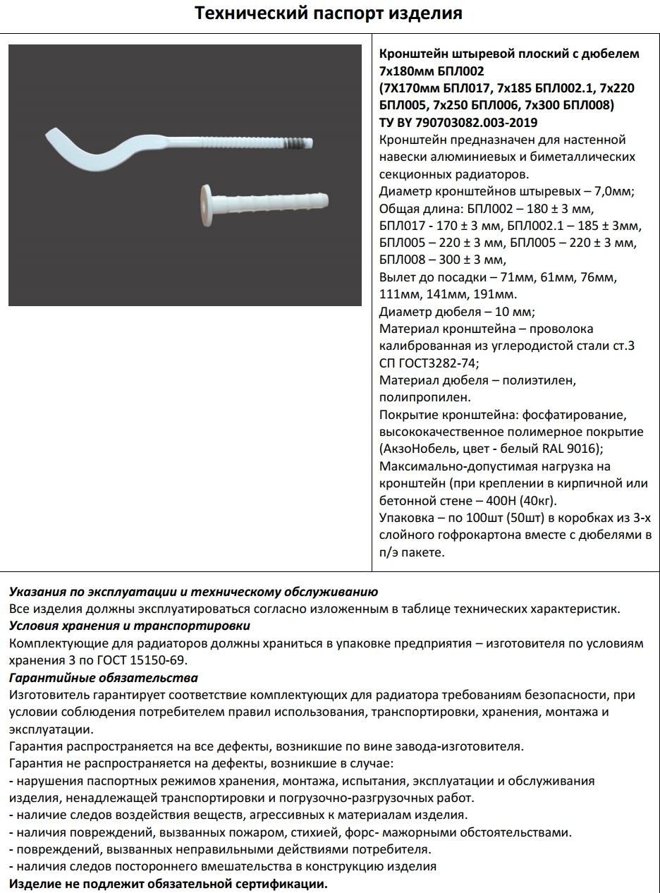 Кронштейн штыревой плоский Кайрос 7*180 мм с дюбелем 10 мм для алюминиевых и биметаллических радиаторов. Крепление настенное.